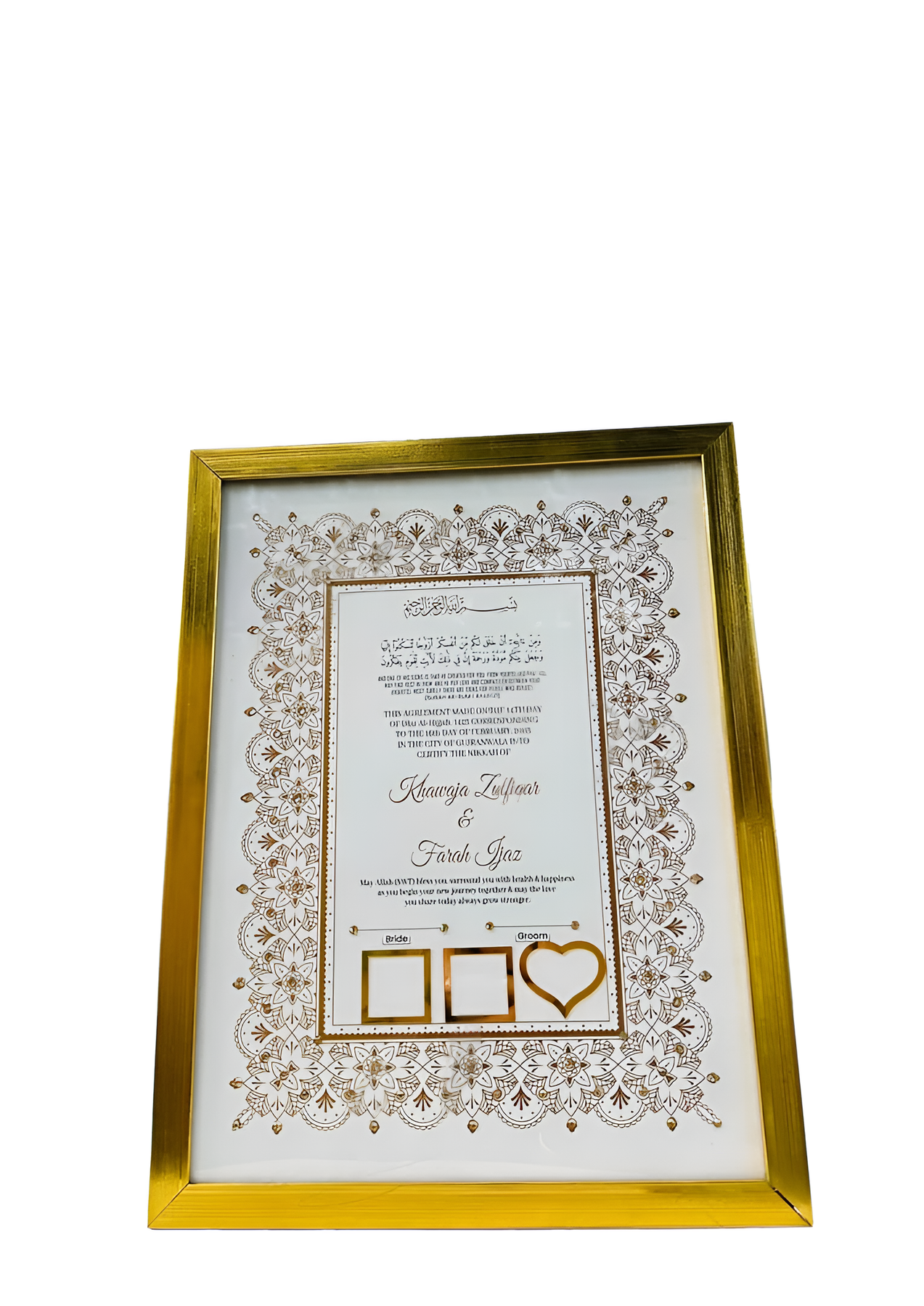 Custom Golden Personalization: Highlight your love story with beautifully crafted golden calligraphy featuring your names.